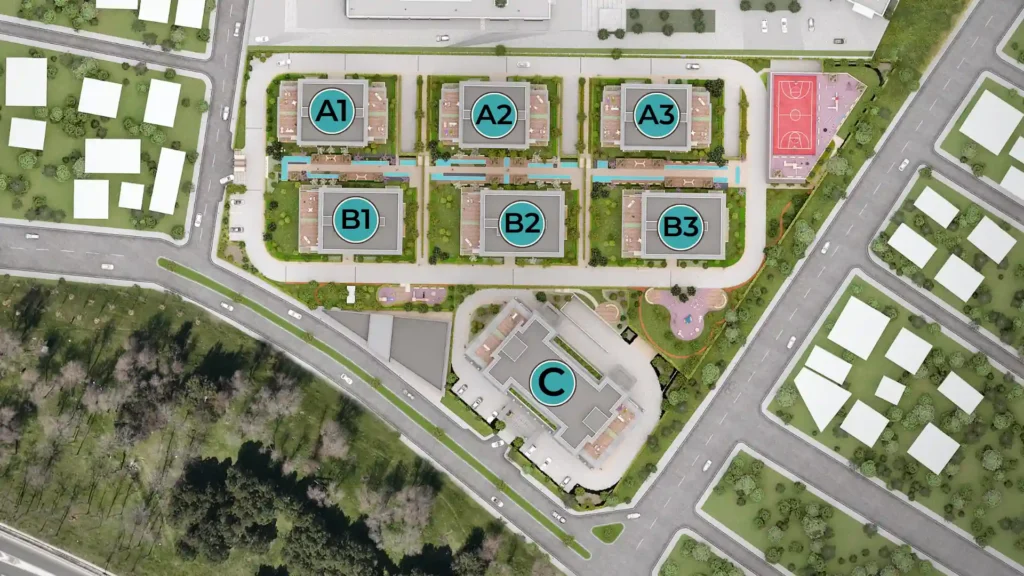 blokları çevreleyen yaratıcı fikirlerle dolu peyzajı ve arkasında uzanan Kent Ormanı ile